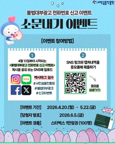 [서민금융진흥원] 불법대부광고 전화번호 신고 소문내기 이벤트!! 100